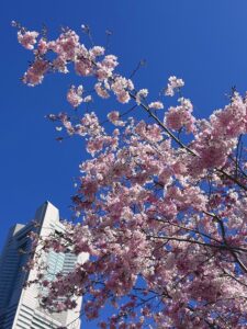 桜木町駅前広場の様子です。桜木町駅前広場のサクラ(ジンダイアケボノ)が見頃です!写真を多くの方が撮られていました。